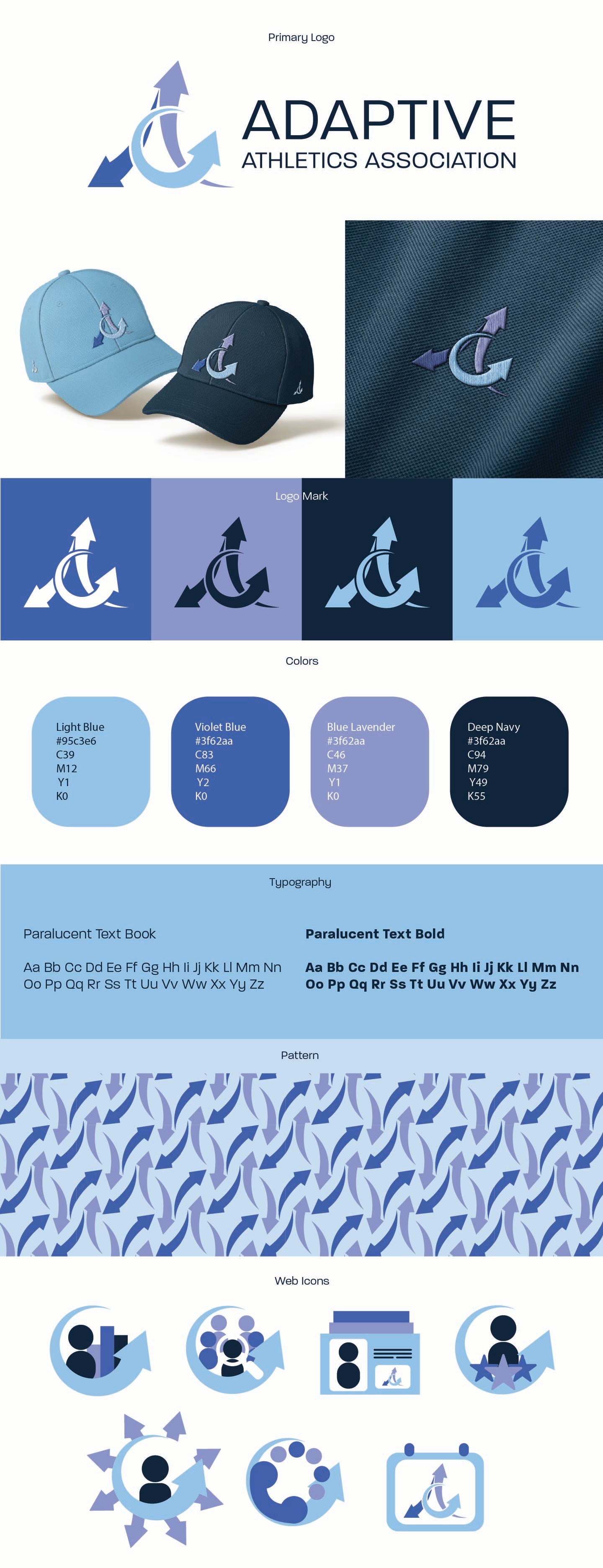For the colors, I took the original palette and adjusted the hues slightly and added the light blue for the third arrow. I also made the decision to start using a deep navy blue for the type instead of the original black to tie the text into the blues of the logo. I also changed the typefaces to the Paralucent text family instead of Arial text as the main typeface.